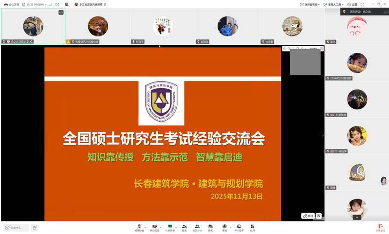 为助力建筑与规划学院学子明晰考研方向、掌握备考策略,2025年11月13日,学院以“知识靠传授 方法靠示范智慧靠启迪”为主题,开展全国硕士研究生考试线上经验交流会。
