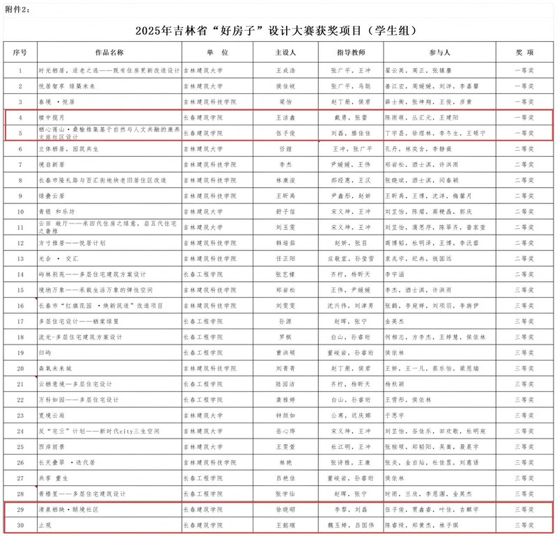近日,由吉林省住房和城乡建设厅主办、吉林省勘察设计协会承办的2025年“好房子”设计大赛圆满落幕,建筑与规划学院参赛团队立足专业积淀、秉持创新思维完成设计作品,在学生组竞赛中表现优异,从93项参赛作品中脱颖而出,荣获一等奖2项、三等奖2项,此次获奖是赛事组委会对参赛学生专业能力与实践水平的认可,也集中体现了学院在教学改革、实践育人及学科建设方面的阶段性成效。